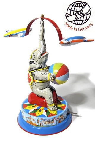 Our elephant spins the balanced airplanes on his trunk while holding a colorful ball. Our beautiful Elephant + Aviators is a genuine German Elefant mit Fliegern made by tin toy craftman, Joseph Wagner (JW). His lever is attached on the amusement park base to start the action.
