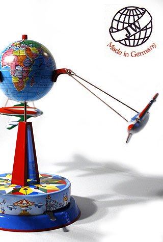 This Flight ride is a hand-made, original heirloom quality tin amusement toy. We found one of the last tin toy artists in Germany using the classic tin plates and tools to produce this delightful toy.