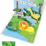 Surprise! Our Jungle Birthday Party Greeting card features a happy gang of animals popping in from everywhere. The clever card includes a Happy Birthday banner and a smart monkey hanging from the palm trees when you open the card. Can you find all of the jungle friends? A special keepsake Birthday Card for your jungle animal!