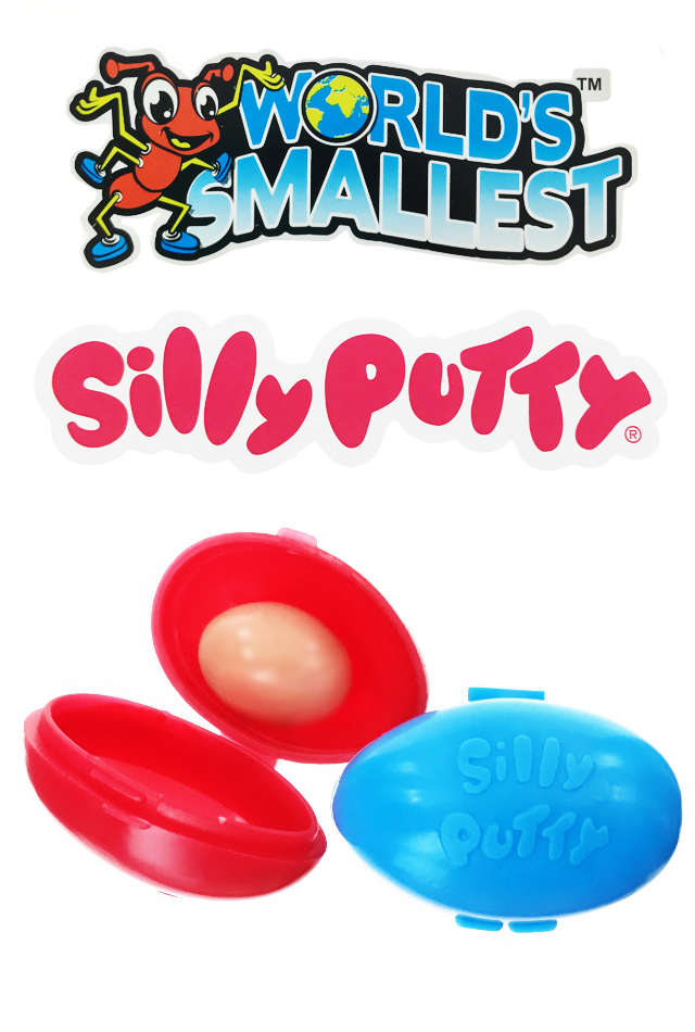 It’s the classic Silly Putty in 2 tiny eggs with the “Real Solid Liquid Toy” inside! You get one red and one blue egg with 3 grams of wonder putty. Each 1.5 inches wide egg is the World’s Smallest version of the classic toy.